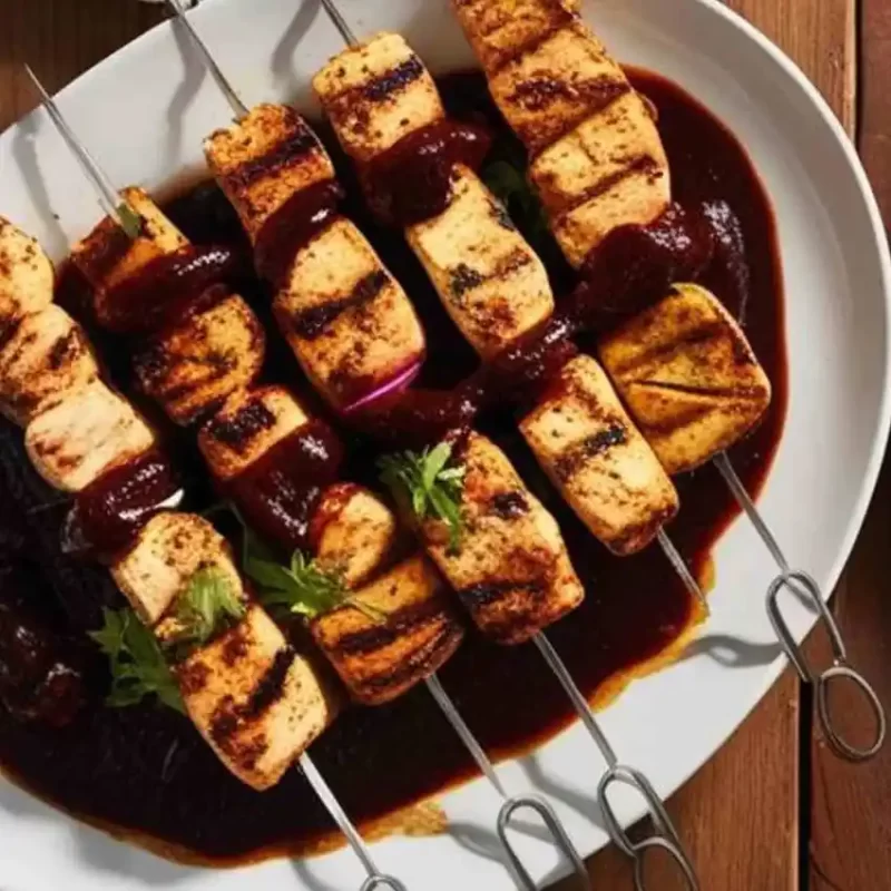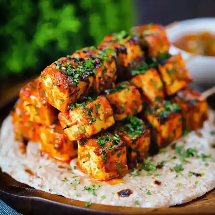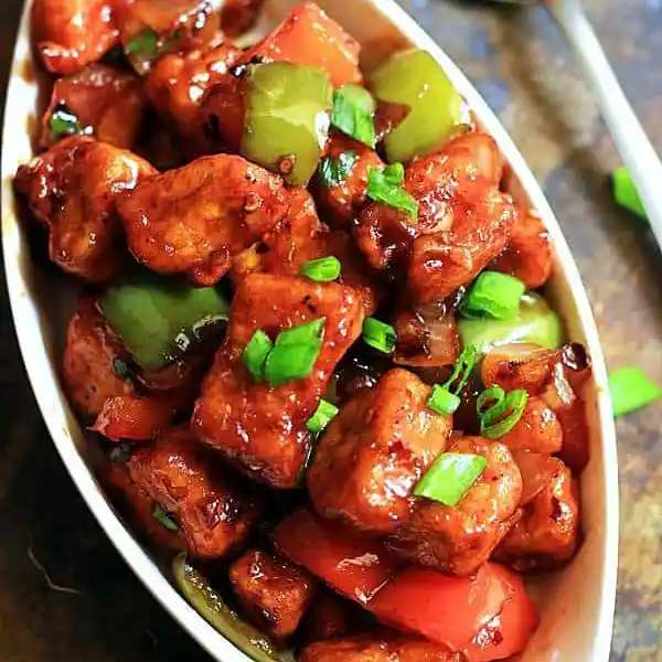 Cubed cottage cheese, stir fried with onion, garlic, red pepper, spring onions and chillies in tomato ketchup and soya sauce.